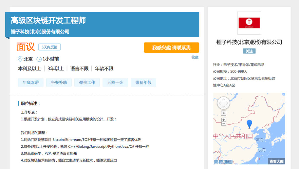 锤子科技好像也要开端布局区块链项目了,现在这家公司已经在招聘网站“猎聘”发布了