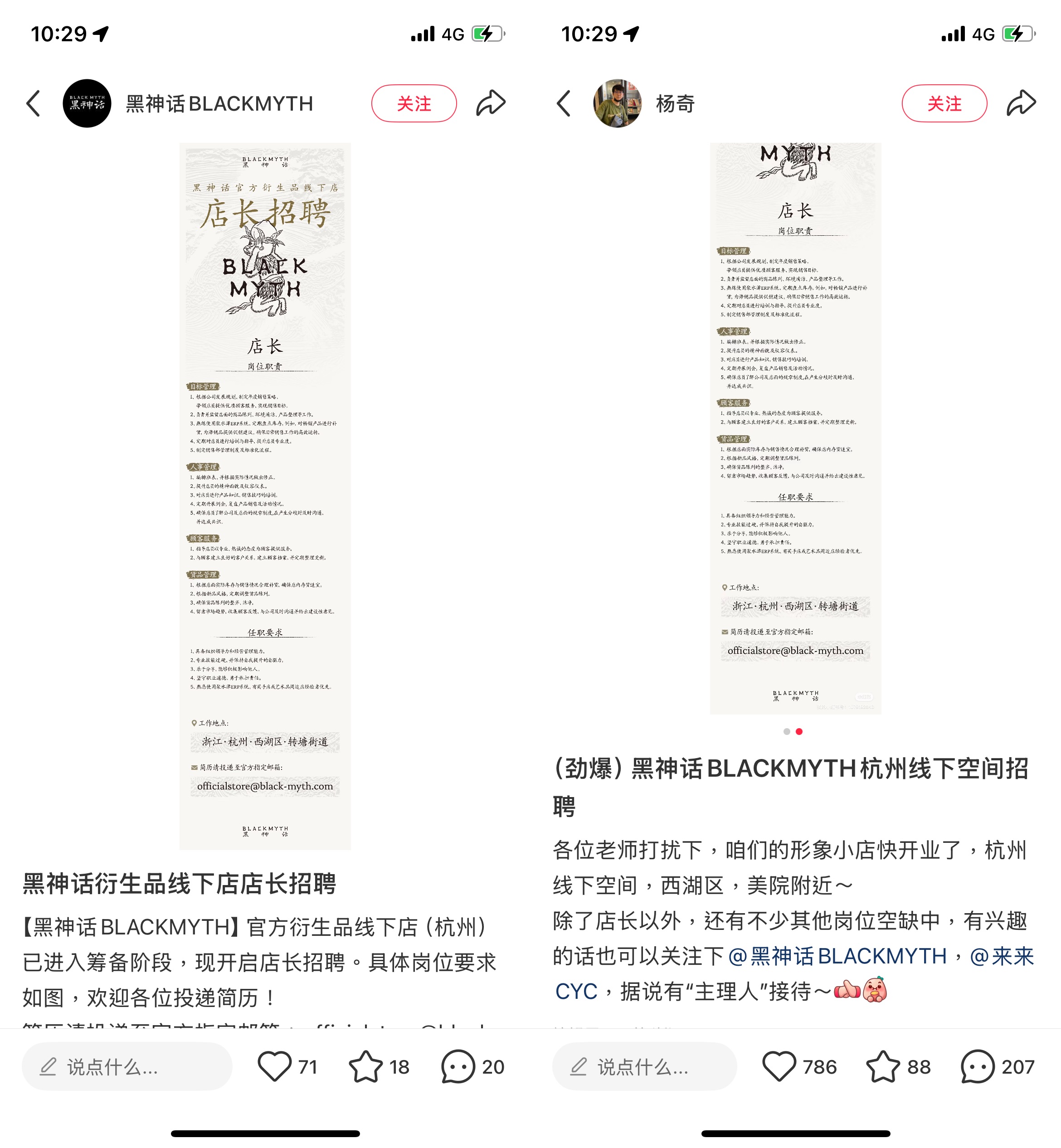《黑神话:悟空》美术总监杨奇近来发布了官方品牌“黑神话 BLACKMYTH”杭州线下店的
